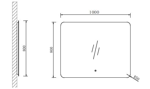 Зеркало в ванную со светодиодной подсветкой с обработанными краями. Сенсорный выключатель, управляется касанием сенсорной кнопки