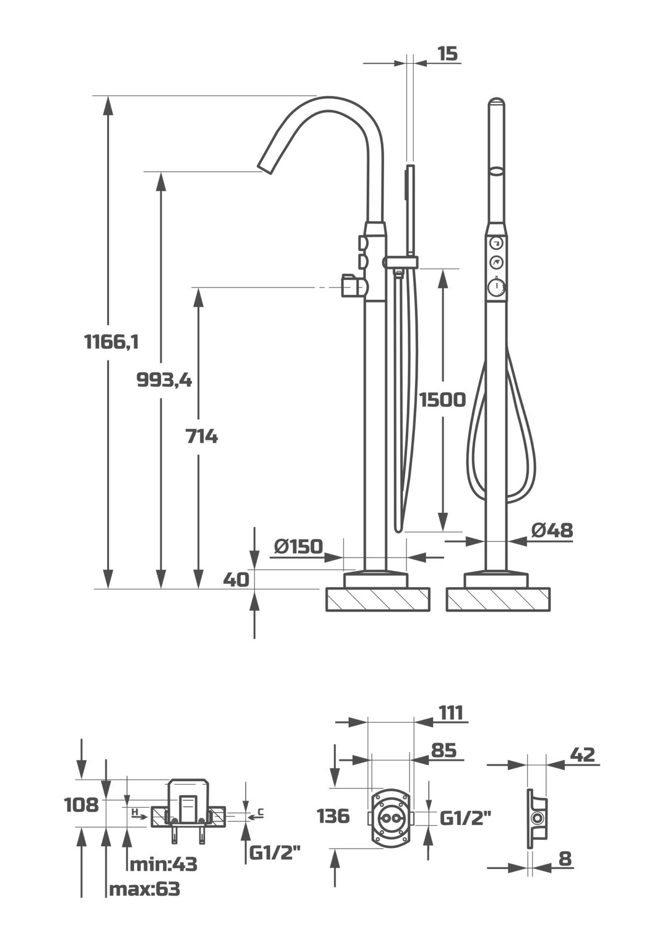 Схема товара Напольный смеситель для ванны PL3098